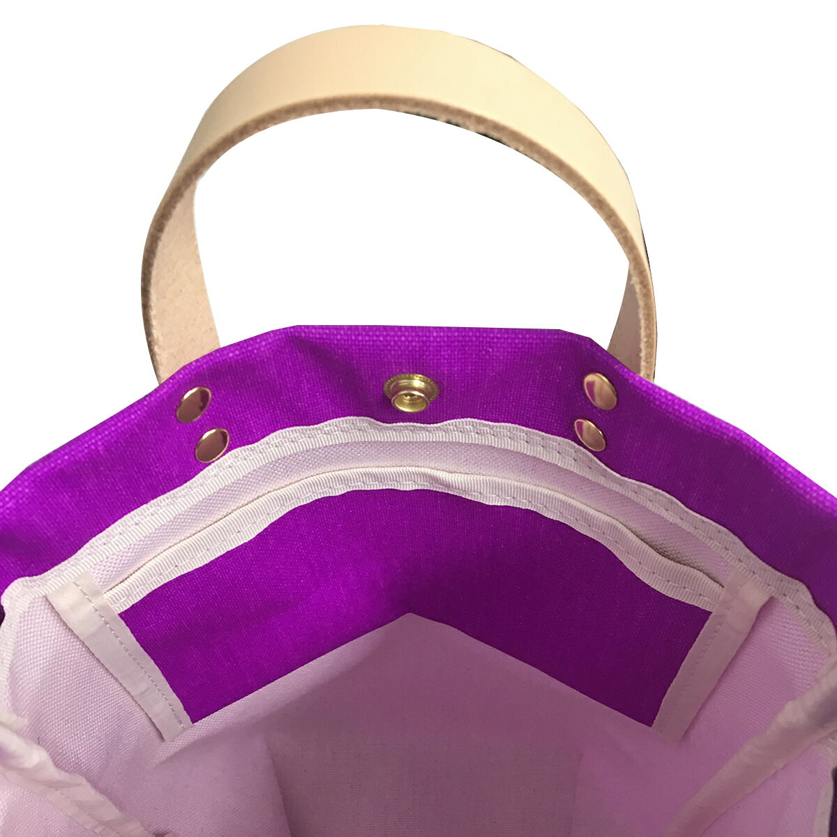 ヌメ革のハンドルに鮮やかな蛍光顔料プリントを施したキャンバス生地を組み合わせています。