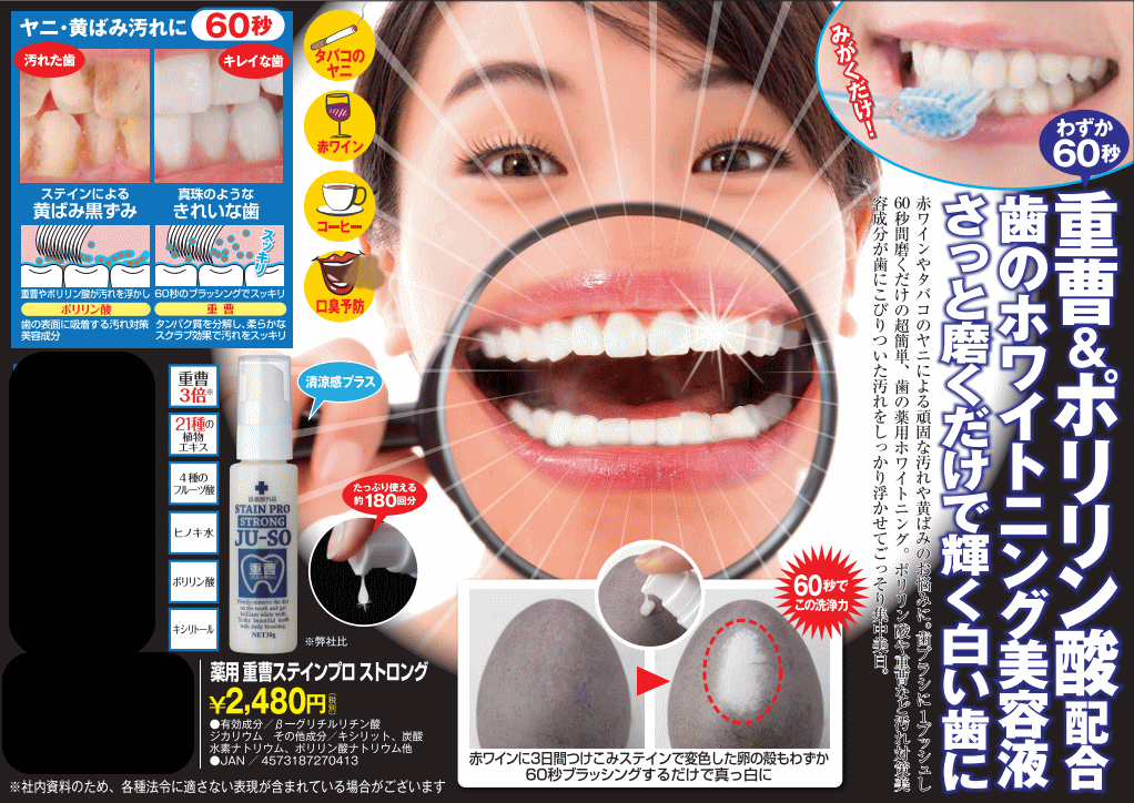 効果効能:歯肉(齦)炎の予防、歯周炎(歯槽膿漏)の予防、 口臭の防止、歯を白くする、口中を浄化する、口中を爽快にする。